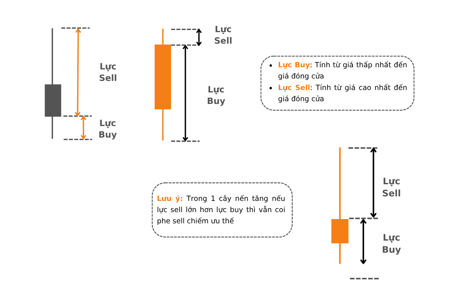 👉 Lưu ý: Không bao giờ đọc lực nến một mình. Luôn đặt nó trong bối cảnh tổng thể: xu hướng lớn, vùng giá quan trọng, volume và các mô hình nến.