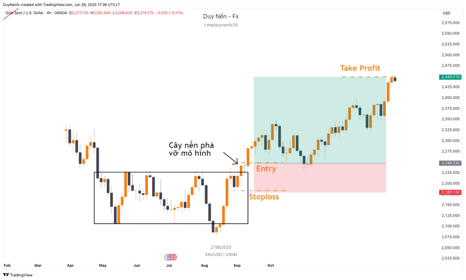 Entry: tại điểm breakout hoặc khi giá test lại vùng biên vừa phá.