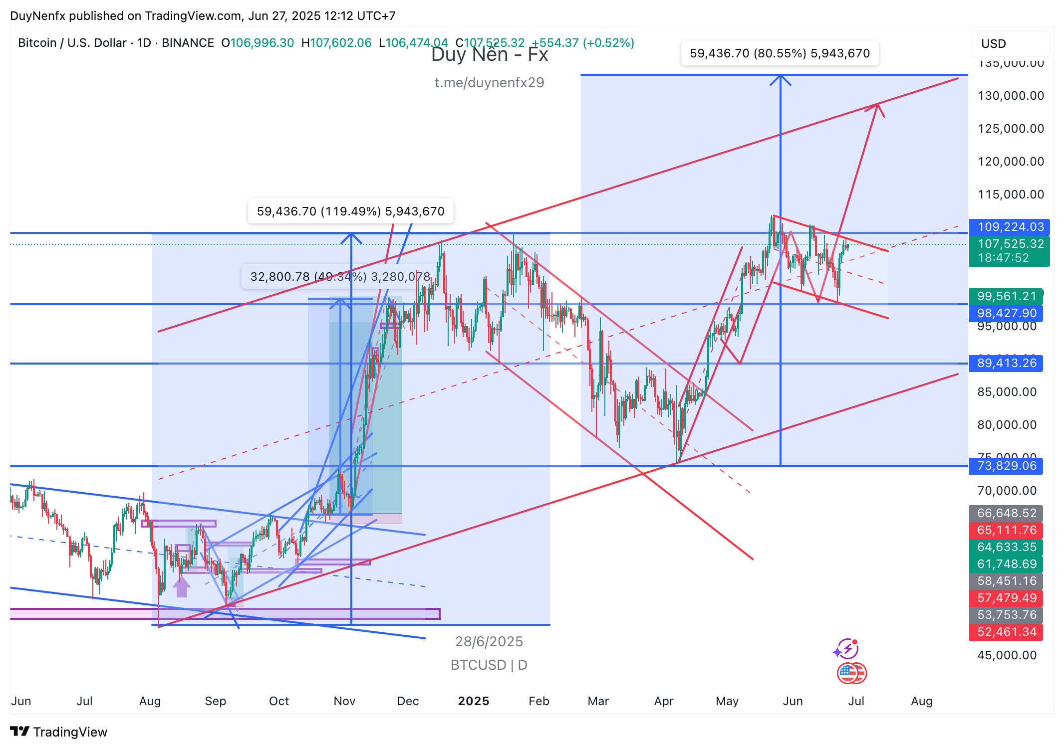 Update Plan BTC giao dịch ngày 27/06/2025 trên khung D cũng hình thành mô hình cốc tay cầm.
