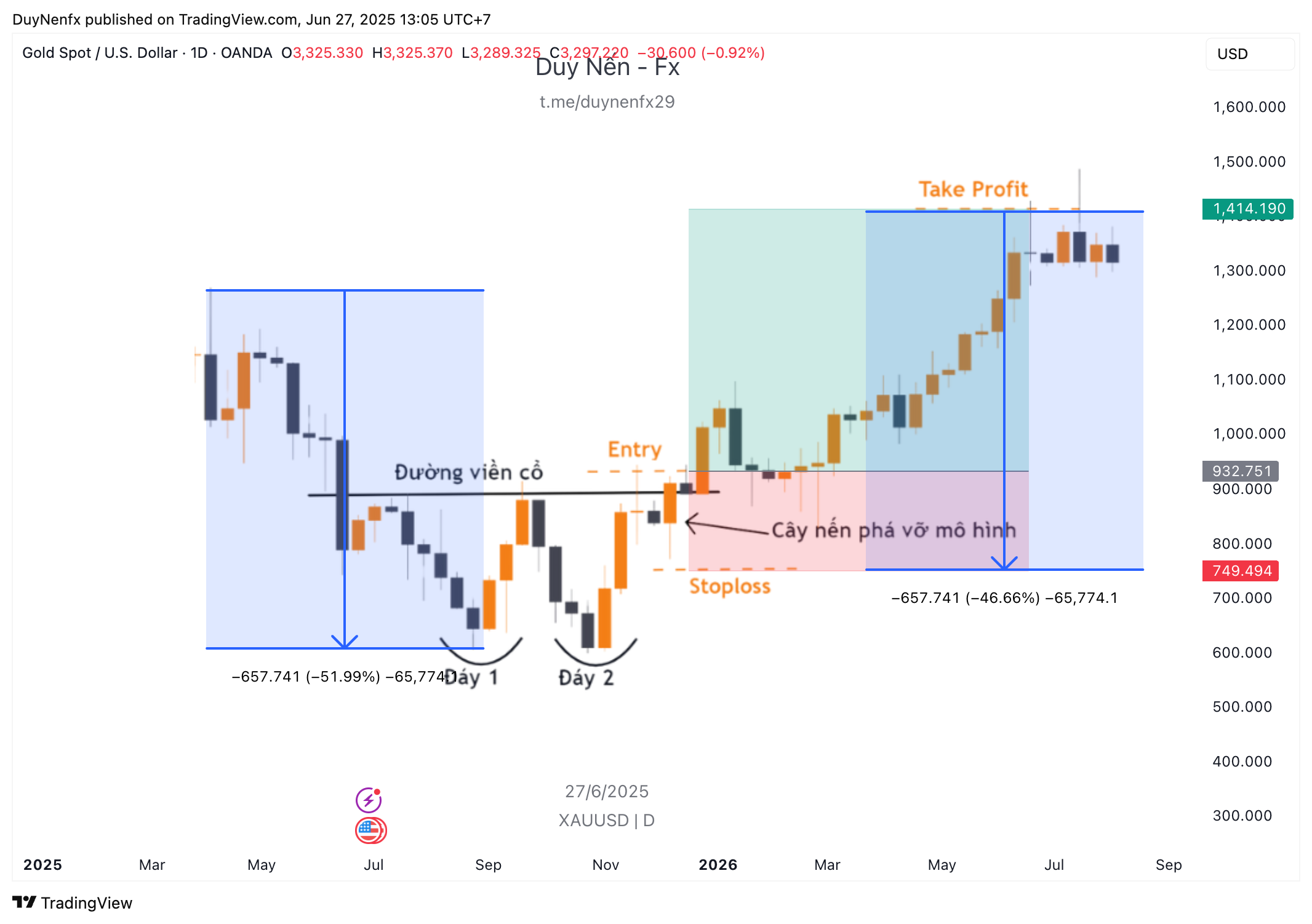 Bối cảnh: Xu hướng Giảm và sau khi tạo 2 đáy có xu hướng Tăng phá qua đường cổ