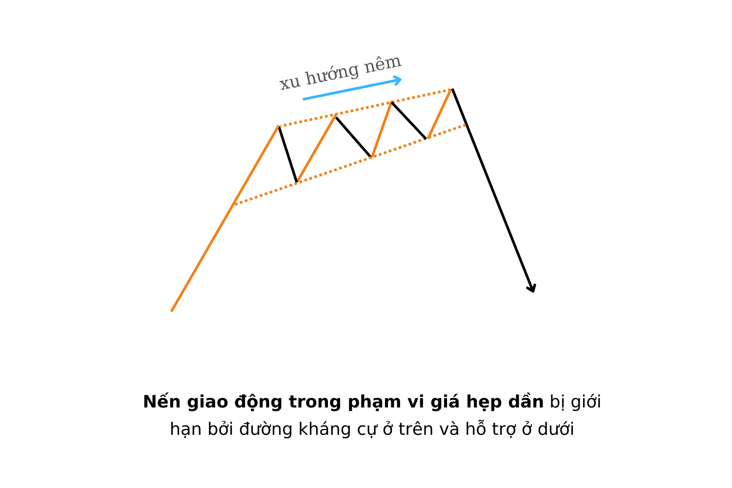 Về hình dạng, nêm giảm được tạo thành từ hai đường xu hướng dốc xuống, trong đó đường kháng cự phía trên và đường hỗ trợ phía dưới cùng hướng xuống, nhưng đường kháng cự dốc hơn. Điều này cho thấy mỗi lần giảm giá tiếp theo đều yếu hơn lần trước, và biên độ dao động ngày càng hẹp lại – báo hiệu áp lực bán đang cạn dần.