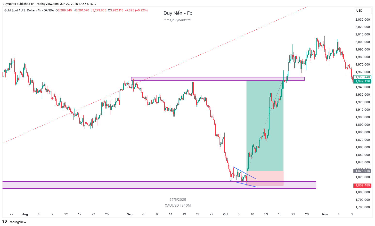 Bối cảnh: Giá đi vào vùng cầu của khung D và trên khung H4 cho cây nến tín hiệu phá vỡ mô hình nêm giảm. Đã đủ điều kiện vào lệnh