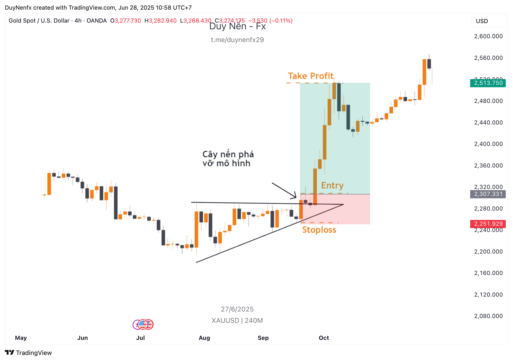 - Entry: Trong trường hợp này xuất hiện cây nến phá vỡ đi lên khỏi cạnh trên nên chúng ra vào entry luôn