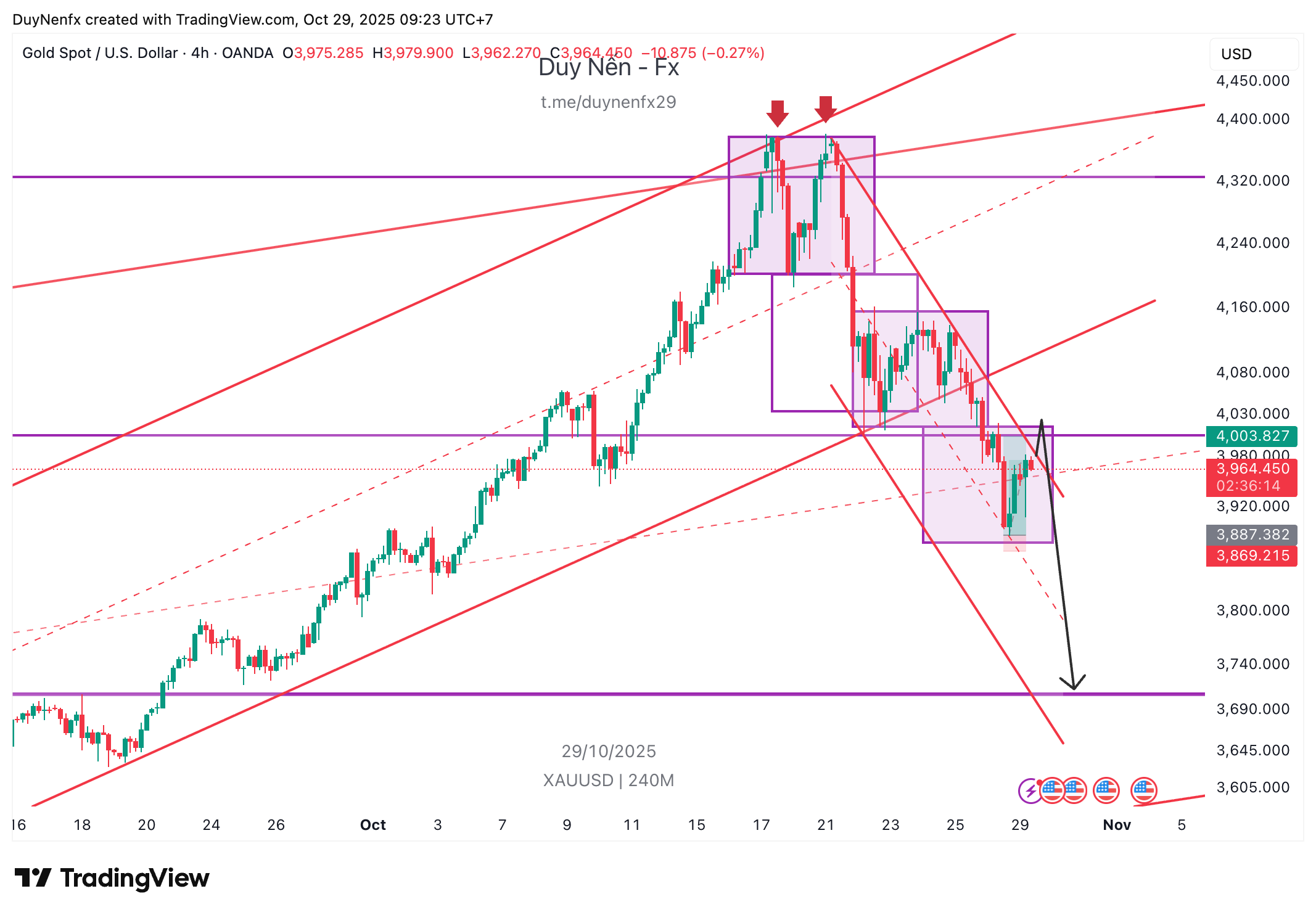 Vàng đang ở trong một kênh giá giảm sau khi đạt đỉnh kỷ lục $4,382/oz và trải qua một cú xả vào ngày 21/10. Giá hiện tại đã giảm xuống dưới ngưỡng tâm lý quan trọng $4.000/oz.